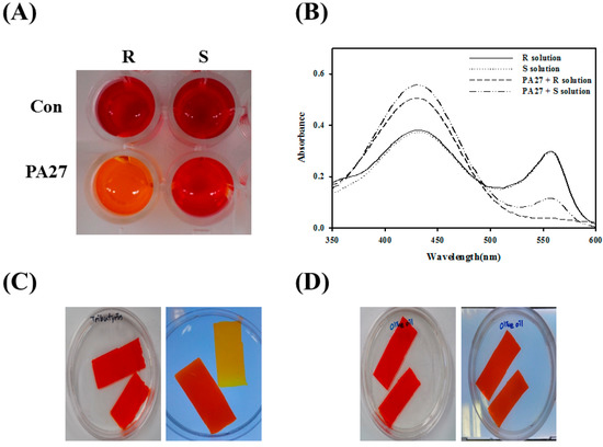 (A) pH shift assay was conducted in the presence of (R)- or (S)-methyl (R)-3-hydroxy-2-methylpropanoate; (B) The absorbance spectrum of each solution after 1 h was measured; (C,D) Activity staining of PA27 in non-denaturing gel towards glyceryl tributyrate (C) and olive oil (D).