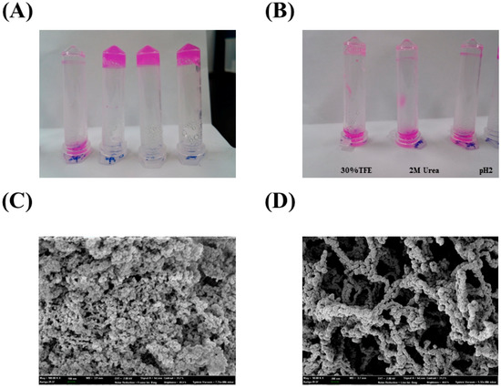 (A) Hydrogel formation was investigated under several conditions (20 mM DTT, buffer only, 1 M NaCl, and 1 mM Cu2+, (from right to left); (B) Inhibition of hydrogel formation by 30% TFE, 2 M urea, and 50 mM glycine-HCl (pH 2.0); (C,D) SEM images of the PA27 hydrogel. Representative images at 50 kX (C) and 100 kX (D) are shown.