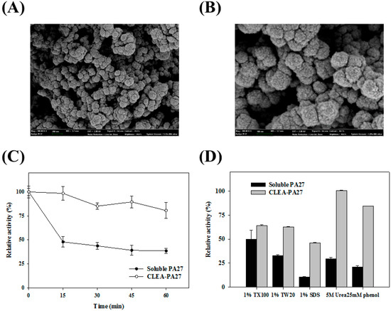For immobilization, crosslinked enzyme aggregates of PA27 (CLEA-PA27) were formed by precipitating enzymes in the presence of 80% AMS with glutaraldehyde crosslinking [18]. The SEM images of the immobilized PA27 showed mainly globular structures with high packing density (Figure 4A,B). For thermostability analysis, soluble PA27 as well as immobilized PA27 were incubated for 1 h at 70 °C and the enzyme activity was measured at various time intervals. After 1 h of incubation, free PA27 showed ~30% of its initial activity, while immobilized PA27 retained most of its initial activity (Figure 4C).