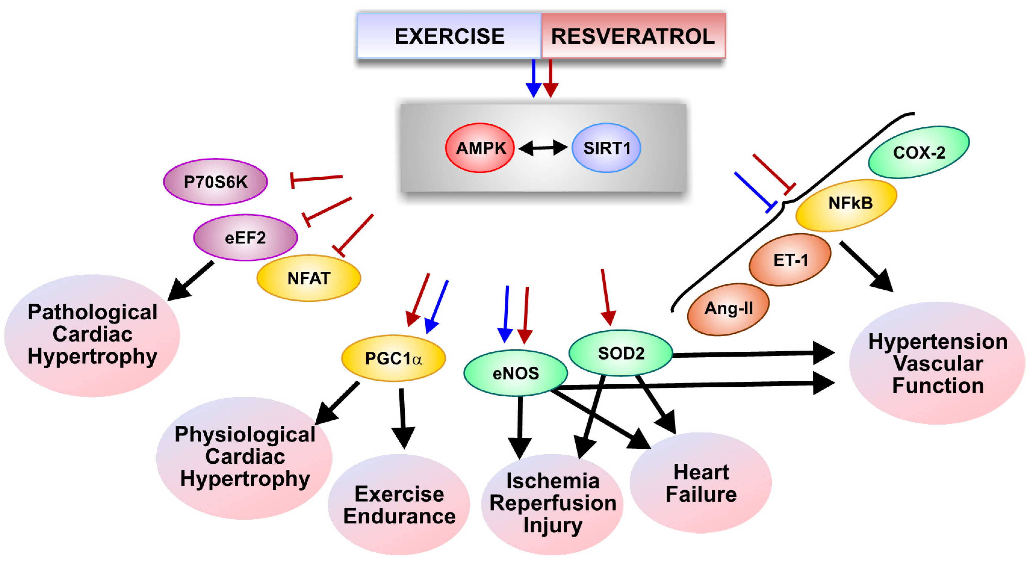 Molecular pathways regulated by exercise training and resveratrol in the heart, skeletal muscle and vasculature. Blue arrows/lines indicate molecular pathways activated by exercise and red arrows/lines indicate molecular pathways activated by resveratrol. AMPK, AMP-activated protein kinase; Ang-II, angiotensin-II; COX-2, cyclooxygenase-2; eEF2, eukaryotic elongation factor2; eNOS, endothelial nitric oxide synthase; ET-1, endothelin-1; NFAT, nuclear factor of activated T-cells; NFkB, nuclear factor kB; p70S6K, p70 S6 kinase; PGC1α, peroxisome proliferator activated receptor gamma coactivator; SIRT1, sirtuin-1; SOD2, superoxide dismutase-2.