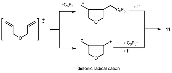 Usually diallyether (DAE, 10) can trap efficiently the poly or perfluoroalkyl radicals resulting in the formation of tetrahydrofuran derivatives (Clock reaction) [8]. However, in this case, besides the major product, 11, a small amount of 1:1 adduct (12) was also obtained (Scheme 4).