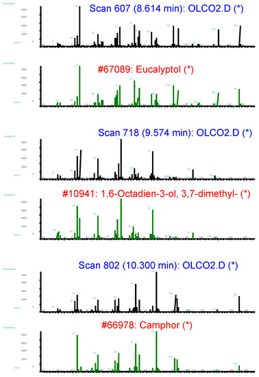 The comparison of mass spectra obtained experimentally in a GC/MS analysis (black, side up each frame) and NIST library spectra (green, down). The identification was made using PBM search from HP MSD ChemStation.
