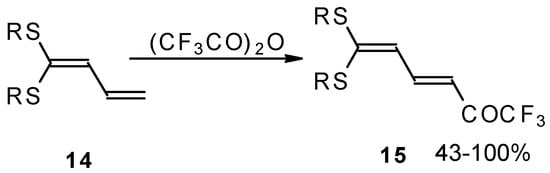 Trifluoroacetylation of trithioorthoacetates results in the acylated ketene thioacetals in high yield (Scheme 4) [25]. The products seem to result from trifluoroacylation of ketene dithioacetals formed by elimination of thiols from trithioorthoacetates.