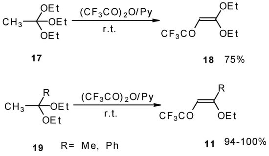 Trifluoroacylation of triethylorthoacetate and the diethylacetal of some methyl ketones proceeds similarly (Scheme 5). It is very interesting that this reaction takes place only in the case of trifluoro(trichloro)acetic anhydride. In the case of acetic anhydride this reaction does not proceed [26].