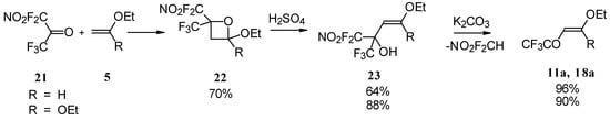 4-Ethoxy-1,1,1-trifluoro-3-buten-2-one 11a was firstly prepared by the three step procedure from nitropentafluoroacetone. Cycloaddition of nitropentafluoroacetone 21 with ethylvinyl ether gives rise to the formation of oxetane 22, subsequent cleavage of the four-membered ring in the presence of sulphuric acid leads to the formation of the corresponding carbinol 23. The thermolysis of this carbinol in the presence of K2CO3 gives rise to the target CF3 ketone. A similar transformation was also investigated for ketene diethylacetal (Scheme 7) [28, 29].
