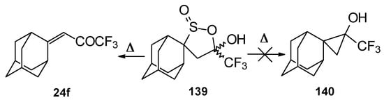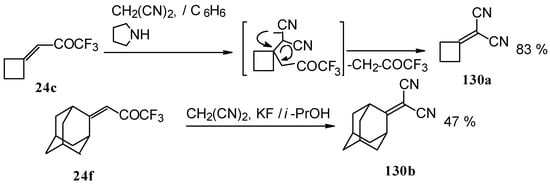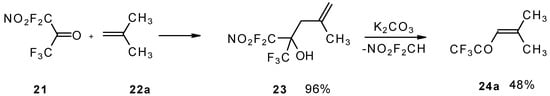 The reaction of nitropentafluoroacetone 21 with isobutylene gives rise to the corresponding carbinol 23 (Scheme 8). Subsequent elimination of difluoronitromethane in the presence of K2CO3 leads to trifluoromethyl-β,β-dimethylvinyl ketone 24a [30].