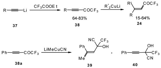 A good route for the synthesis of fluorinated ketones involves 1, 4-addition of an organocuprate to the acetylenic ketones, which are readily obtained by acylation of acetylides (Scheme 15). This method affords ethylenic ketones with high regioselectivity, however stereoselectivity is variable and yields are moderate [46,47,48,49,50].