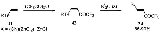 A novel method of the synthesis of trifluromethyl containing unsaturated ketones was described recently [51]. The first step in this approach involves trifluoroacylation of the corresponding vinyltellurides with trifluoroacetic anhydride (Scheme 16) [52]. The reaction proceeds stereospecifically to give only Z isomers of β-trifluoroacetylvinyltellurides in good yields. The subsequent reaction of β-trifluoroacetylvinyltellurides with different zinc cuprates via a conjugate addition-elimination process affords the corresponding α,β-unsaturated trifluoromethyl ketones. In some cases competitive double addition of zinc cuprates takes place [51].