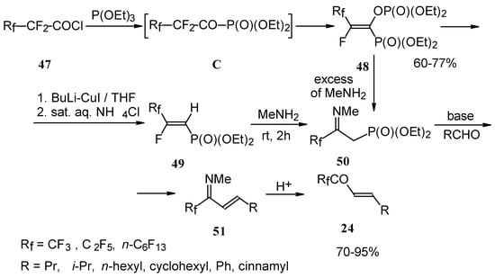 Polyfluoroalkyl α,β-enones may be also prepared from β-iminophosphonates, accessible in four steps from perfluoroalkanoyl chlorides. The β-iminophosphonate anions condensed with an aldehyde lead to the corresponding trifluoromethyl or perfluoroalkyl enones after acidic hydrolysis (Scheme 20) [57].