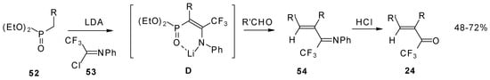 Quite recently a novel one pot procedure based on the Horner-Emmons olefination was elaborated. N-phenylrifluoroacetimidoyl chloride reacts with diethoxyphosphorylmethyl (or ethyl) lithium, generated in situ from diethylmethylphosphonate and lithium diisopropylamide (Scheme 21). Subsequent addition of the aldehyde gives rise to 1-aza-1,3-diene readily converted by HCl hydrolysis to the corresponding unsaturated ketone bearing a CF3 group [58].