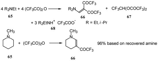In a subsequent investigation it was found that the reaction of triethylamine with an equimolar amount of trifluoroacetic anhydride proceeds almost quantitatively and leads to the product of double trifluoroacetylation of diethylvinylamine (Scheme 28) [74].