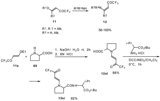 β-Alkyl- or dialkylamino substituted enones bearing a CF3 group are a very interesting type of unsaturated ketone. These compounds are readily available from the reaction of secondary or primary amines (including aromatic ones) with 4-ethoxy-1,1,1-trifluoro-3-buten-2-one or other trifluoroacylated vinyl ethers. The alkoxy group in these enones is easily substituted by ammonia and mono- or dialkylamines with the formation of β-aminosubstituted CF3-bearing enones [75, 76]. 4-Ethoxy-1,1,1-trifluoro-3-buten-2-one can be also used as a protecting reagent in peptide synthesis [77]. The reaction with amino acids proceeds readily at room temperature to give protected amino acids without racemization. The amino acids protected by this procedure were used for dipeptide preparation (Scheme 29). The removal of the N-4,4,4-trifluoro-3-oxo-butenyl protecting group occurs under mild conditions in the presence of 3N HCl.