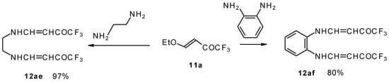 It is also possible to undergo reaction with diamines. The reaction of 4-ethoxy-1,1,1-trifluoro-3-buten-2-one with ethylenediamine and o-phenylenediamine gives rise to the linking of two molecules of a ketone (Scheme 30) [75].