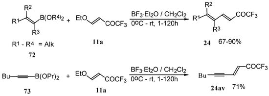 Alkadienyl trifluoromethyl ketones were stereoselectively prepared by the reaction of 4-ethoxy-1,1,1-trifluoro-3-buten-2-one with alkenyldialkoxyboranes in the presence of borontrifluoride etherate (Scheme 37) [82].