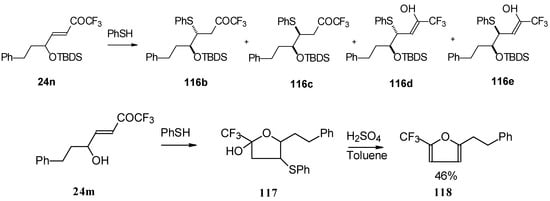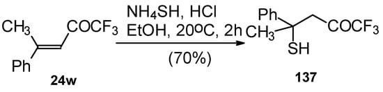 The same transformation proceeds readily also with unsaturated trifluoroacetyl ketones having a thioalkyl group in the β-position (Scheme 31) [76].