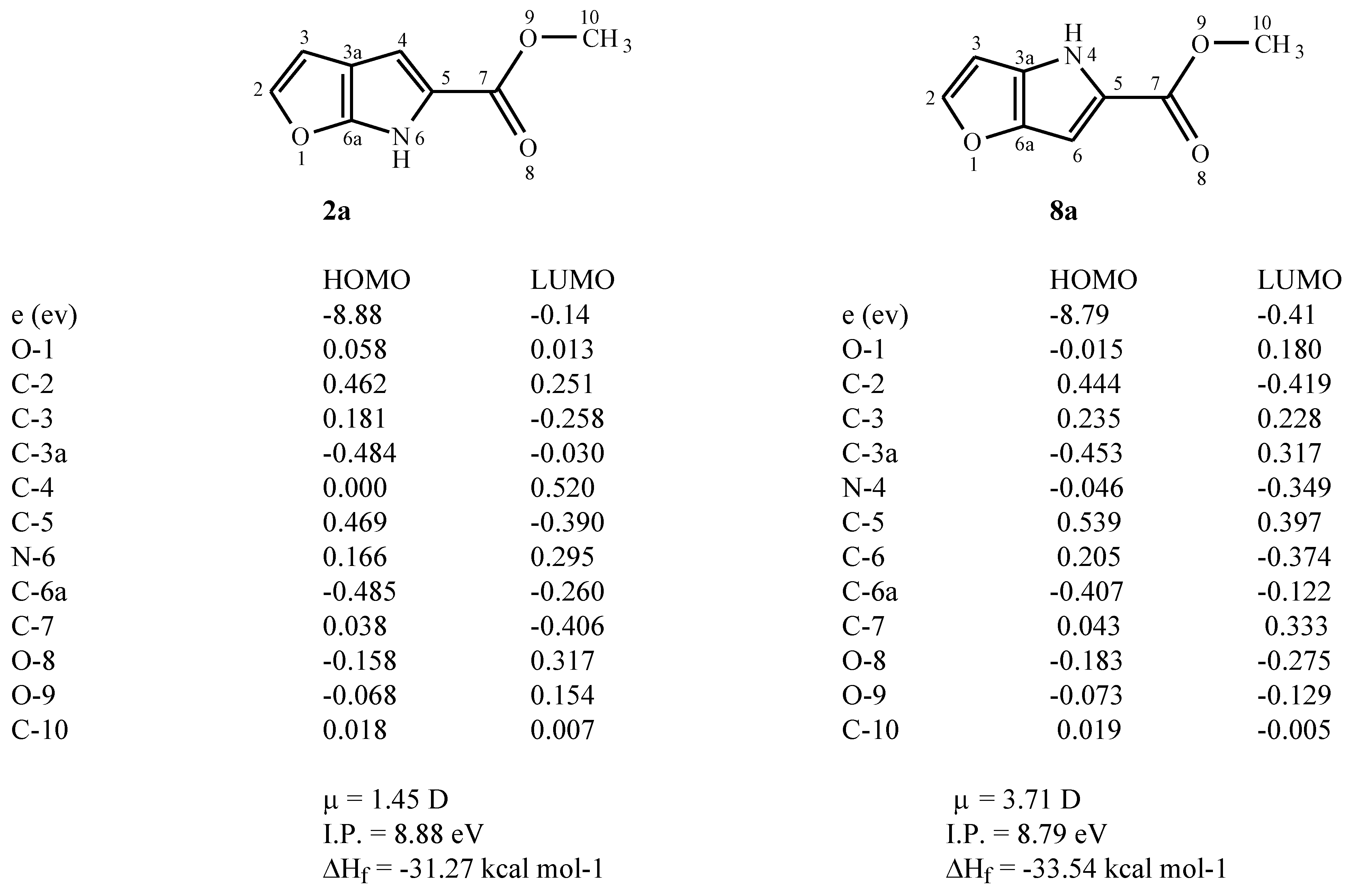 During the synthesis and reaction studies of both systems we found out that the 1,4 system (8) is more stable than its 1,6 positional isomer (2). This empirical conclusion is in agreement with the results of AM1 semiempirical MO calculations that we have carried out for the parent furopyrroles and the ester derivatives 2a and 8a. Figure 1 shows the calculated properties for the methyl esters 2a and 8a including their heats of formation (ΔHf). The 1,4 system (8a) is calculated to be thermodynamically more stable than the 1,6-isomer (2a). The 1,4-system (8a) is also calculated to have a significantly larger dipole moment (μ) (Figure 1), which may result in greater solvent stabilisation. Comparable results were obtained for the unsubstituted heterocycles (Figure 2). Calculated net atomic charges and molecular geometries are given in Table 4, Table 5, Table 6 and Table 7. The calculated ionisation potentials (using Koopmaan' theorem) (Figure 1) are consistent with the classification of these heterocycles as electron-rich.