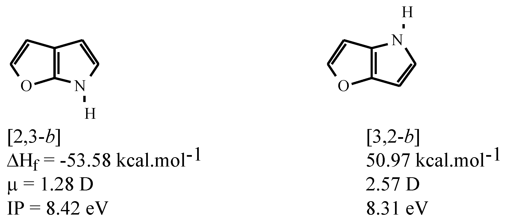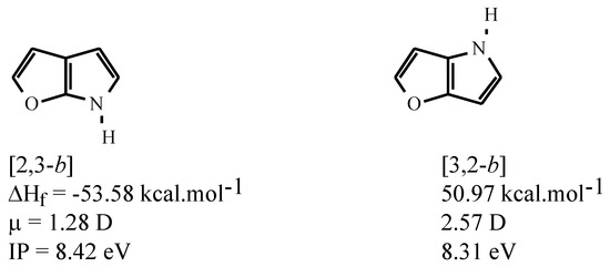 Calculated (AM1) heats of formation (ΔHf) and dipole moments (μ) for parent furopyrroles.
