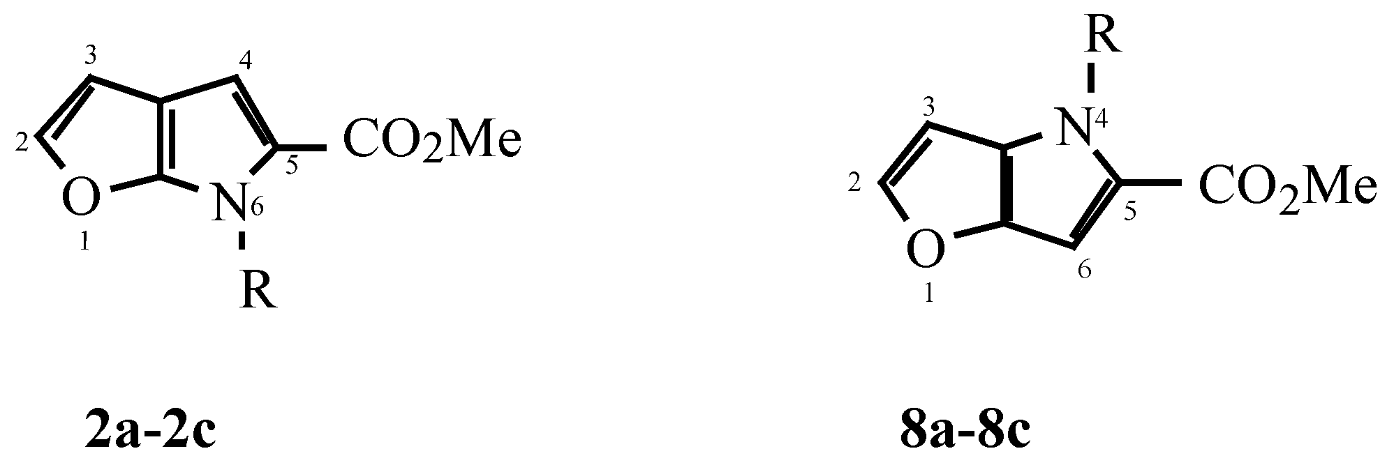 Furo[2,3-b]pyrroles (2a-2c) and their positional isomers furo[3,2-b]pyrroles (8a-8c) belong to A,Bdiheteropentalenes, which possess differing degrees of aromaticity based upon chemical behaviour such as their ability to undergo substitution reactions with electrophilic reagents. A,B-diheteropentalenes rank among the electronrich heterocycles, but a quantitative measurement of their aromaticities is less easily determined [1]. The wide range of potential criteria available for this purpose has been surveyed [1,2].