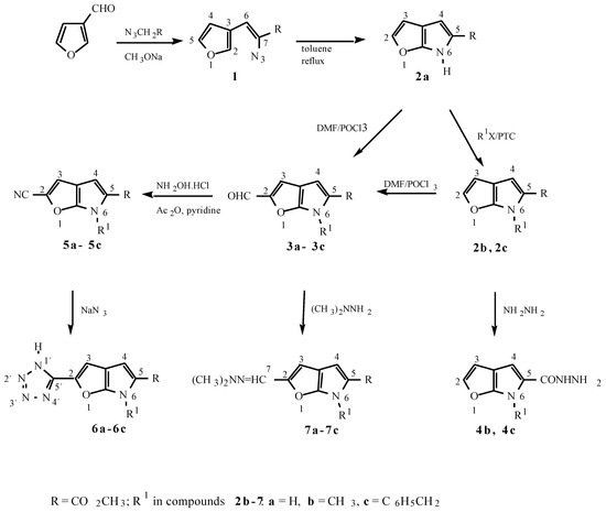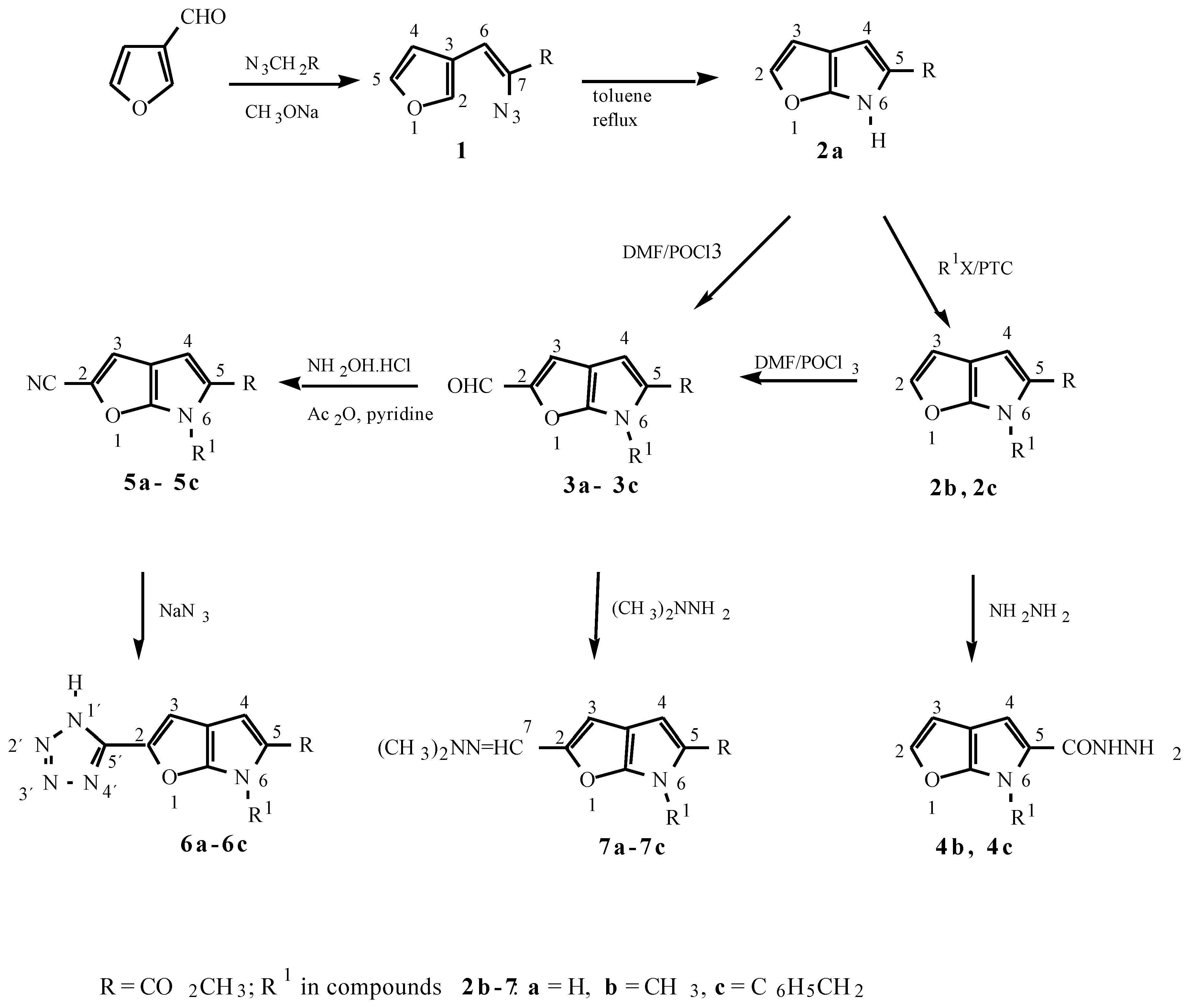 Reaction of 3-furancarbaldehyde with methyl azidoacetate in the presence of sodium methoxide proceeded smoothly to give the azide 1, thermolysis of which was carried out in boiling toluene leading to the compound 2a. Phase transfer catalysis was found to be successful for methylation and benzylation of 2a giving the derivatives 2b and 2c (Scheme 1). The compounds 2a-2c gave under Vilsmeier conditions 2-formylated products 3a-3c. By refluxing the compounds 2b and 2c with hydrazine in ethanol the corresponding hydrazides 4b and 4c were formed. Our experiments to synthesize 6H- furo[2,3-b]pyrrole-5-carboxyhydrazide (4a) under conditions which were used for preparation of 4b and 4c were unsuccessful.
