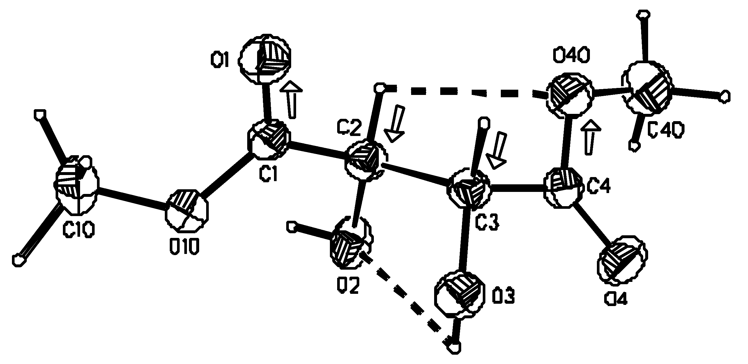 Perspective view of the molecule of (R,R)-tartaric acid dimethyl diester and the atom numbering scheme. Thermal ellipsoids were drawn at 40% probability level. Molecular conformation is stabilized by intramolecular hydrogen bonds (dashed lines) and attractive dipole-dipole interactions (dipoles marked with arrows).