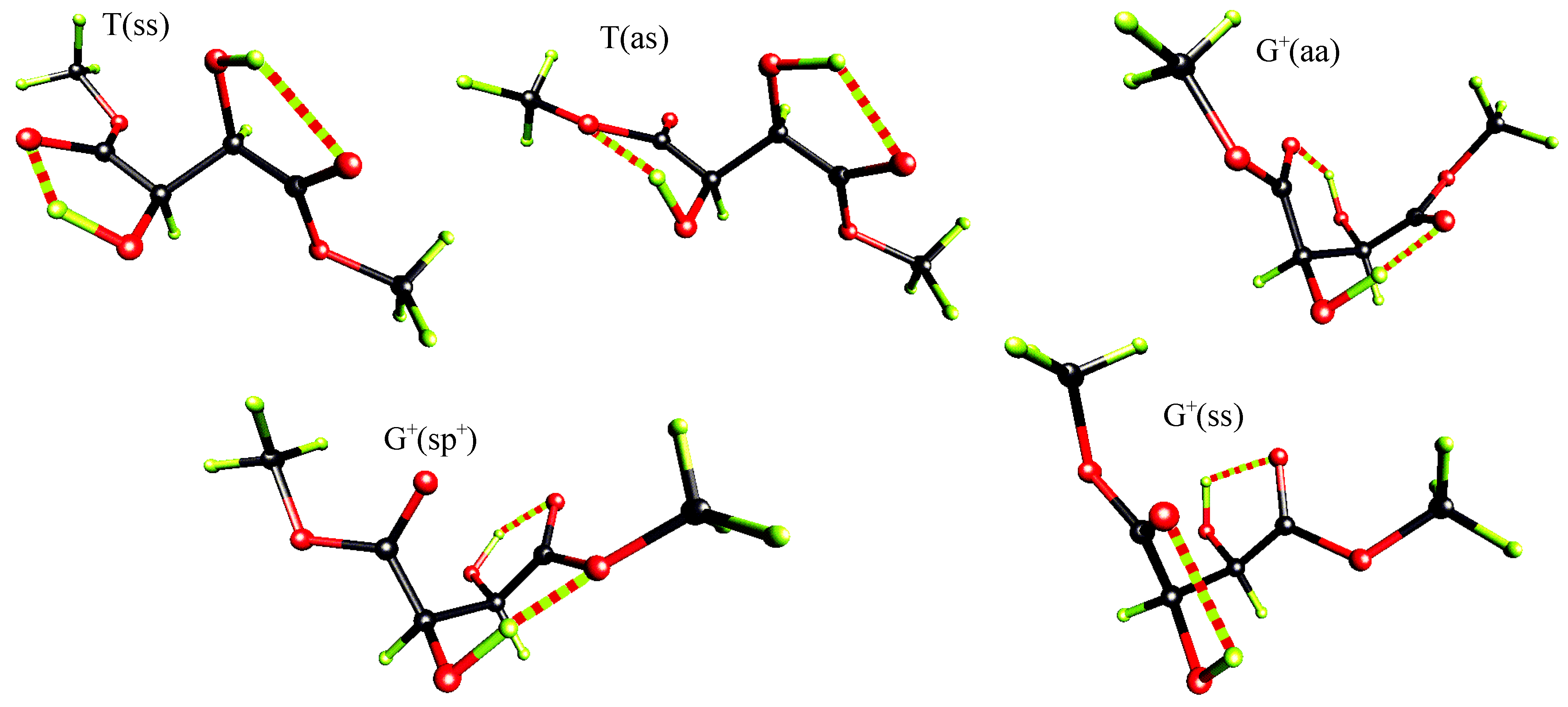 There have been several attempts to predict conformation of dimethyl (R,R)-tartrate on the basis of vibrational circular dichroism (VCD) results. Marcott et al. [3] suggested that dimethyl (R,R)-tartrate exists in two different hydrogen bonded conformers – one with internal hydrogen bonding between (β)OH and O=C groups, and the other with internal hydrogen bonding between (α)OH and O=C groups. Su and Keiderling [4] on the basis of their VCD and NMR studies concluded that the G+ conformer predominates (see Figure 1). Nafie and co-workers [5] interpretation of VCD results required hydrogen bonds between (α)OH and O=C groups, and they pointed to the G+ conformer in preference to the T one. Polvarapu et al. [6] performed further VCD measurements and stated, that their results could be interpreted in favor of the T conformation of dimethyl (R,R)-tartrate only when allowing the charge flow along the central C*-C* bond. They concluded however, that the G+ form could not be ruled out only on the basis of VCD results and may exist in equilibrium with the T conformer. They performed ab-initio calculations up to RHF/6-31//RHF/STO-3G level [7] for seven chosen structures of (R,R)-tartaric acid and found, that within these conformers the T form is energetically favored. By analogy they postulated the same for dimethyl (R,R)-tartrate. The T conformation was indicated by 13C NMR data for tartaric acid [8] and its dimethyl diester [9]. Raman optical activity studies (ROA) also indicated the T conformer for these molecules [10]. Semiempirical studies on (R,R)-tartaric acid and its dimethyl diester [11] also pointed to the T conformer as the favored structure.