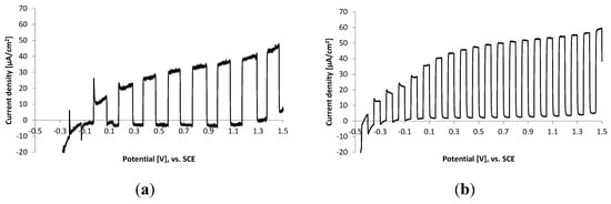Chopped light polarization curve of (a) plasmatic TiO2 thin films and (b) sol gel TiO2 thin films. Irradiation wavelength 365 nm (1.46 mW/cm2), electrolyte 0.1 M Na2SO4, scan rate 5 mV·s−1.