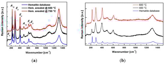 Due to the small thickness of Fe2O3 films the crystalline structure of deposited films was assessed by Raman spectroscopy (Figure 4). We have reported previously that the hematite crystalline phase can be achieved already during the HiPIMS deposition []. However in order to improve the charge transfer between the hematite and FTO substrate as well as among the hematite grains themselves, the films had to be calcined at 650 and 750 °C always for 40 min in air. The database hematite spectrum is presented for reference and it unambiguously matches the measured HiPIMS Raman spectra and no significant difference (see Figure 4) between the films was evident. On the contrary to HiPIMS deposition in the case of sol gel films, the hematite structure was only achieved after calcination of the deposited precursors at 400 °C. A further increase to 600 °C has no influence on the crystalline structure.