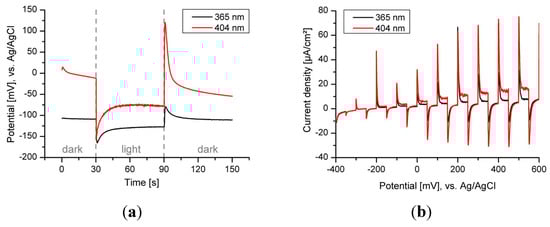 Open circuit potential (OCP) (a) and chopped light polarization curve (b) for sol gel hematite thin films calcined at 600 °C (FTO electrode). Irradiation wavelength 365 nm and 404 nm.