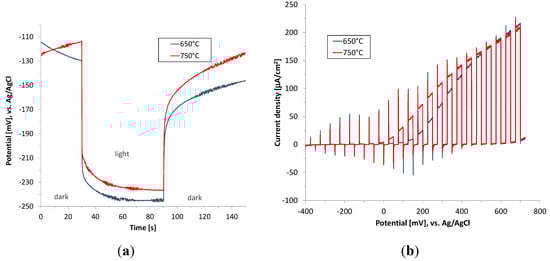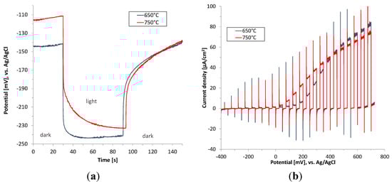 Open circuit potential (OCP) (a) and chopped light polarization curve (b) for hematite thin films calcined at 650 °C and 750 °C (FTO electrode). Irradiation wavelength 365 nm (1.46 mW/cm2).