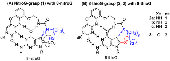 We have focused on the development of recognition molecules for the 8-oxidized guanosine derivative based on the tricyclic cytosine analog “G-clamp” [8,9,10,11,12], and have reported the “8-oxoG-clamp” derivatives for the selective fluorescent detection of 8-oxo-dG [13,14,15]. Most recently, a new 1,3-diazaphenoxazine nucleoside derivative bearing a thiol arm, nitroG-grasp (1), has demonstrated the efficient capture of 8-nitroguanosine via multiple hydrogen-bonded complexes [16]. The displacement reactivity of nitroG-grasp (1) depends on the thiol pKa and the length of the alkyl linker between the urea and the thiol group. For the new capture molecules for 8-thioguanosine, we based the design on a hydrogen bonded complex, such as that between the 8-nitroguanine portion and the 1,3-diazaphenoxazine portion connecting the urea-linker (Figure 1A). A nucleophilic attack of the 8-sulfur atom on the chloride leaving group was expected to form the corresponding covalent bond. The urea-type linker (X=NH) and the carbamate-type linker (X=O) were anticipated to form a suitable hydrogen bond with the thioenolate form or with the thioamide form, respectively (Figure 1B, nitroG-grasp, 2a–c, 3). In this study, we report the synthesis of 8-thioG-grasp derivatives and evaluated their reactivity with 8-thioguanosine.