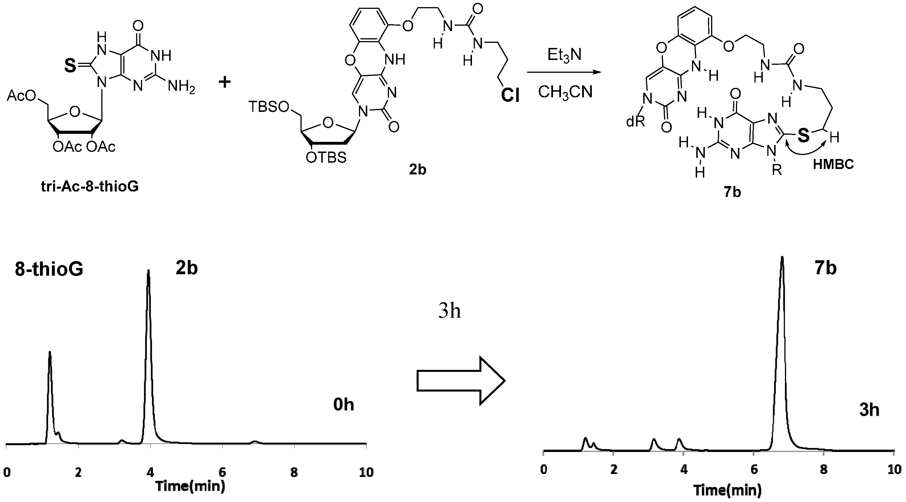 This product was isolated, and its structure was confirmed as depicted in 7b by 1H-NMR, ESI-MS, and HMBC (see the Supporting Information). The HMBC spectrum indicated the distinct correlation between the C8 of the 8-thioguanine unit and the methylene protons next to the sulfur atom of 7b.