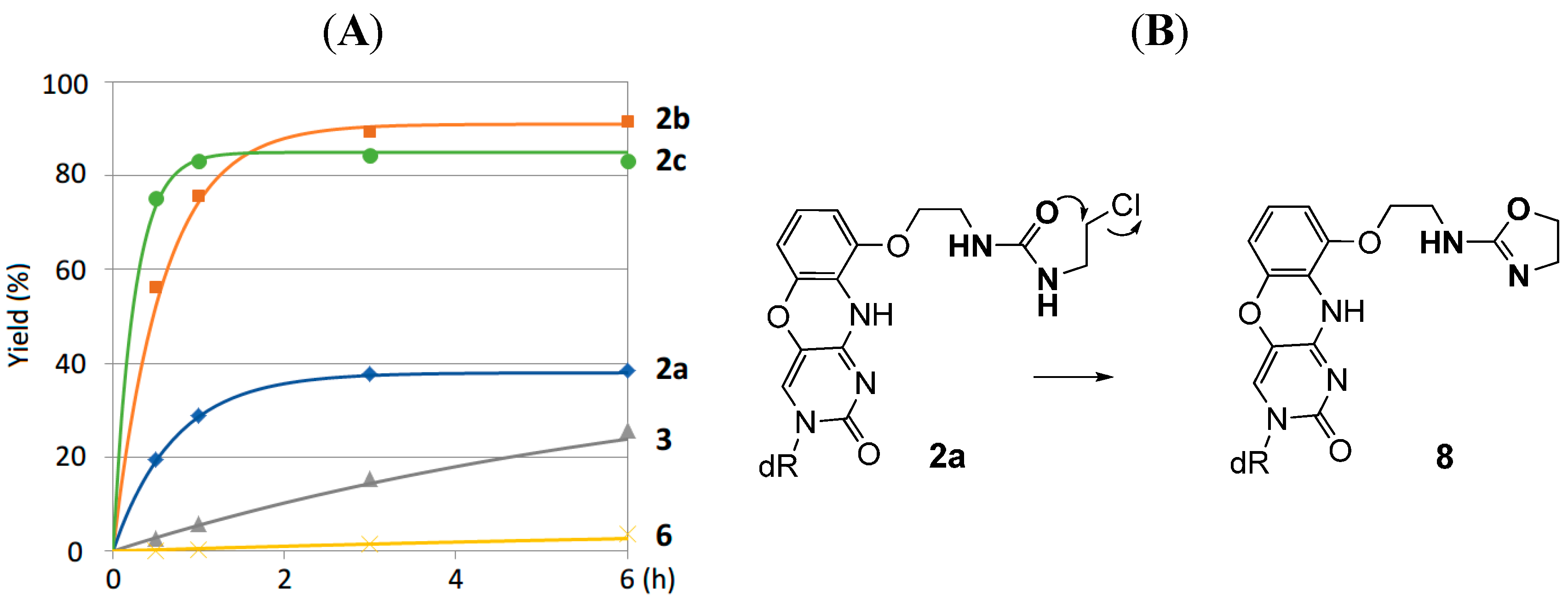 (A) Comparison of the time courses of the reactions with 8-thioG-grasp (2a–c and 3) and the control compound 6. (B) Byproduct 8 formed via the intramolecular reaction of 2a. Product yields were obtained at the indicated time points by HPLC analysis, as described in the footnote to Figure 2. dR represents the 3′,5′-diOTBS-2′-deoxyribosyl group.