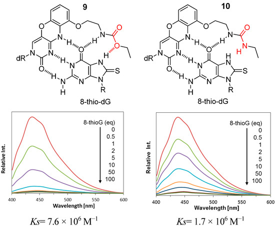 In contrast, the carbamate type 3 showed a significantly decreased efficiency compared with the compounds 2 with the urea-type linker. This is of great interest because 8-thioketo tautomer of 8-thioG is stable in neutral organic solvents [18] and forms more stable complexes with the carbamate type 9 than with the urea type 10 (Ks in CHCl3, 9: 7.6 × 106 M−1 vs. 10: 1.7 × 106 M−1) (Figure 4). Accordingly, it is reasonably explained that the 7N-H of 8-thioG is deprotonated by Et3N to form the 8-thioenolate, thereby facilitating hydrogen-bonded complexes with the urea-type compounds (2b and 2c) such as shown in Figure 1B to exhibit efficient reactivity. As the pKa value of 7N-H of 8-thioguanosine is around 8.5 (see the Supporting Information), Et3N is a suitable base for its deprotonation. No adduct was formed with N-(3-chloropropyl)-2-(pyrene-1-yl) acetamide (6), a control without a binding site, emphasizing the contribution of the hydrogen-bonded complexation of 2b and 2c for efficient reactivity. Among the urea-type 8-thioG-grasp derivatives, 2a produced the adduct in a low yield. The HPLC monitoring showed that 2a formed the byproduct 8 as a major peak, which structure was determined by H-NMR, ESI-MS and 2D-HMBC, as shown in Figure 3. The amino-oxazoline was formed by intramolecular displacement, which was faster than the intermolecular nucleophilic attack from 8-thioG. It should be emphasized that the displacement of the sulfur atom of 8-thioG in the complex with 2b or 2c is favorable compared with the intramolecular amino-oxazoline ring formation because this type of amino-oxazoline ring formation was not observed for 2b or 2c.