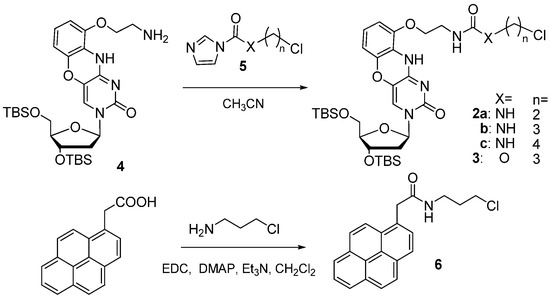 In this study, 2′,3′,5′-tri-O-acetyl-8-thioguanosine (tri-Ac-8-thioG) was used as a substrate and was synthesized from 2′,3′,5′-tri-O-acetyl-8-bromoguanosine according to the literature [17]. The 8-thioG-grasp derivatives were synthesized through the reaction between the imidazole linker unit 5 and the amino group of the 3′,5′-O-diTBDMS-G-clamp unit 4 as a common intermediate (Scheme 1). The chloroalkylamine or chloropropanol were treated with carbonylimidazole in CH3CN in the presence of triethylamine to form the corresponding imidazole intermediates 5, which reacted with 4 to produce the desired 8-thioG-grasp derivatives. N-(3-Chloropropyl)-2-(pyrene-1-yl) acetamide 6 was synthesized from 1-pyrene-acetic acid as a control compound with no complexation site for 8-thioG.