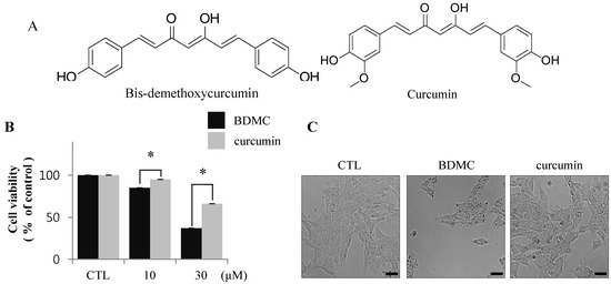 The structural difference between BDMC and curcumin is the presence of a dimethoxyl group at the ortho-position of the phenol rings of curcumin, as shown in Figure 1A. To evaluate the cytotoxic effects of BDMC and curcumin on activated HSCs, we examined the pro-apoptotic effect of BDMC on HSC-T6 cells, reflected as altered cell integrity, using MTT assay. HSC-T6 cells were exposed to BDMC or curcumin, each at 10 and 30 μΜ concentrations, for 24 h. We observed that BDMC, unlike curcumin, potently induced apoptosis in HSC-T6 cells (Figure 1B). After incubation with both compounds at 30 μΜ for 24 h, BDMC was found to significantly reduce the number of HSC-T6 cells (Figure 1C).