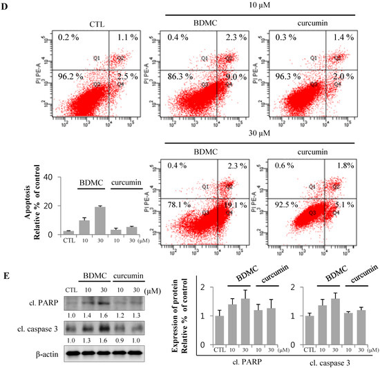 After treatment with BDMC or curcumin at 0 (control), 10 and 30 μM, cells were detached with ethylenediaminetetraacetic acid (EDTA)-free trypsin and washed twice with cooled PBS. Cells were re-suspended in 400 µL of 1× loading buffer with 5 µL of Annexin-V and 5 µL of propodium iodide (PI; Becton-Dickinson, San Diego, CA, USA) for 15 min on ice in the dark. Analyses were performed using FACS Calibur analyzer (Becton-Dickinson, San Diego, CA, USA).