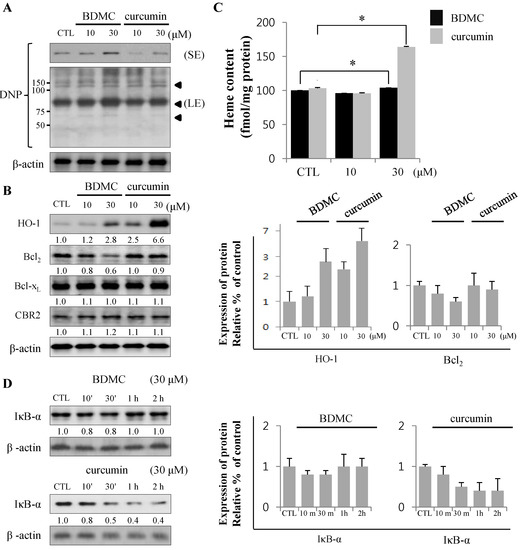 Since curcumin was shown to be the strongest inducer for Heme oxygenase (HO)-1 in several previous in vitro and in vivo experiments [15], we evaluated the effect of curcuminoids on the expression of this cytoprotective protein. As shown in Figure 2A, protein carbonylation is a type of oxidative modification of proteins promoted by reactive oxygen species (ROS).