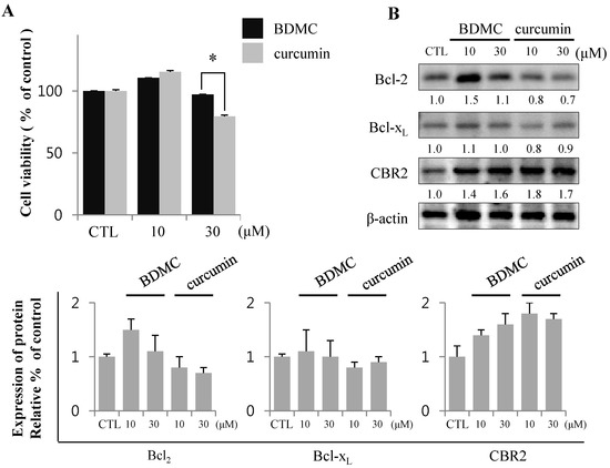BDMC induces apoptosis in HSCs, but not HepG2. (A) HepG2 was treated with 10 and 30 µM of BDMC or curcumin for 24 h. MTT assay was performed to assess cell viability; (B) Intracellular levels of Bcl2, Bcl-xL and CBR2 were measured by western blot with β-actin used as a loading control. Data are expressed as mean ± S.D. (n = 3), * p < 0.05.