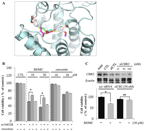 BDMC induces apoptosis of HSCs through an effect on CBR2. (A) Structure-based approach evaluating binding between curcuminoids and CBR2 using in silico modeling; (B) Cells were pre-incubated with CBR2 antagonist sr144528 (1 μM) for 2 h prior to treatment with 10 and 30 µM of BDMC or curcumin for 24 h; (C) Cells were transfected with CBR2 siRNA or control siRNA for 24 h. Data are expressed as mean ± S.D., * p < 0.05.