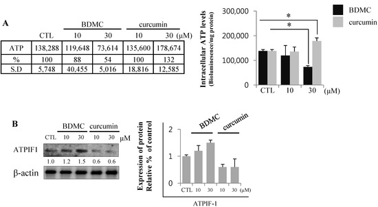Mitochondrial membrane potential (MMP) is the decisive factor that determines cellular survival or death. MMP is maintained by a proton gradient generated across a mitochondrial inner membrane, which drives ATP production. Oxidative stress inhibits MMP formation, which induces cell death by depleting intracellular ATP levels [21]. Cellular ATP levels are therefore an important parameter in the initiation and progression of cell death [22]. The endogenous levels of ATP reflect the presence of cell injury, with BDMC significantly reducing ATP levels in HSC-T6 cells. Cellular ATP was depleted to approximately 50% of the baseline levels upon treatment with 30 μM of BDMC (Figure 6A). Moreover, the expression of ATPase inhibitory factor (ATPIF) 1 increased following BDMC treatment, possibly accounting for the dose-dependent decrease in cellular ATP levels. Conversely, the effect of curcumin on ATPIF1 protein expression was found to be negligible (Figure 6B).