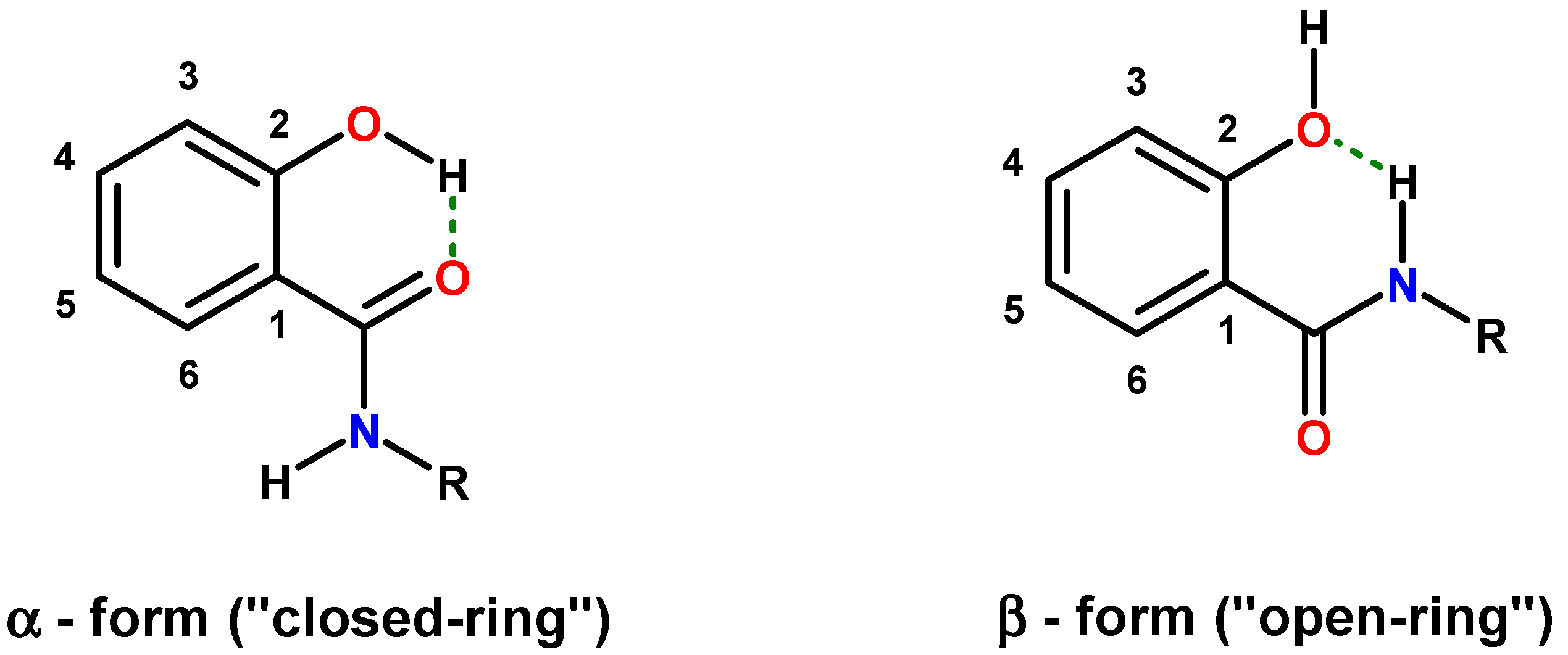 Intramolecular hydrogen bonding in salicylamides creates two distinct conformations: the α-form (“closed-ring”) with the phenol as the H-donor and the amide oxygen as the H-acceptor (OH···O=CNH); and the β-form (“open-ring”) with the amide-NH as a donor and the phenolic oxygen as an acceptor (CONH···OH) (Figure 1).