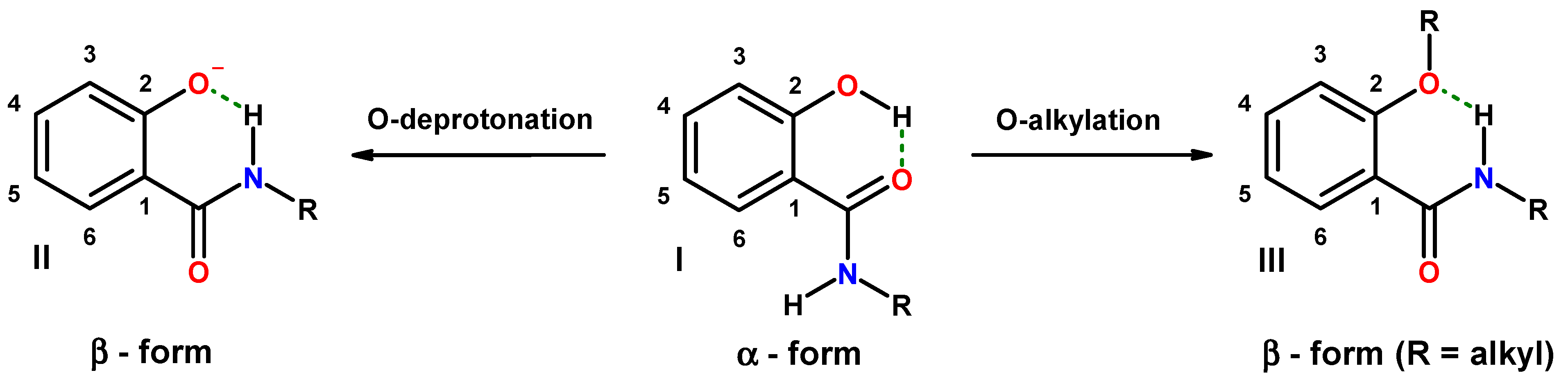 N-monosubstituted 2-hydroxybenzamides prefer the α-form in solution, which can be switched to the β-form by chemical manipulation. Deprotonation of the phenolic group [45,46,47,48] or substitution through alkylation [49] removes the hydrogen atom necessary for the stabilization of the α-form. Concomitantly, the hydrogen acceptor strength of the oxygen atom (oxyanion or alkoxy group) is enhanced. Upon rotation of the amide function, the alternative hydrogen bonding between the phenolate oxygen and amide hydrogen can be established. The result is a switch from the α-form (I) to the β-form ((II) and (III) in Figure 2).