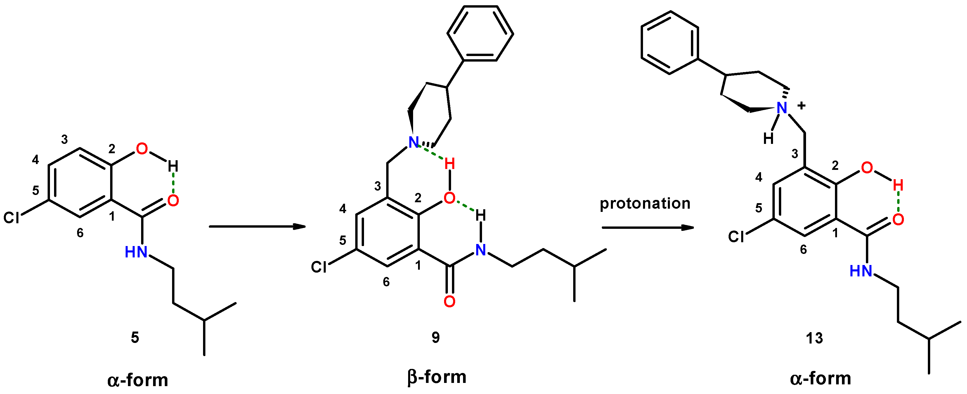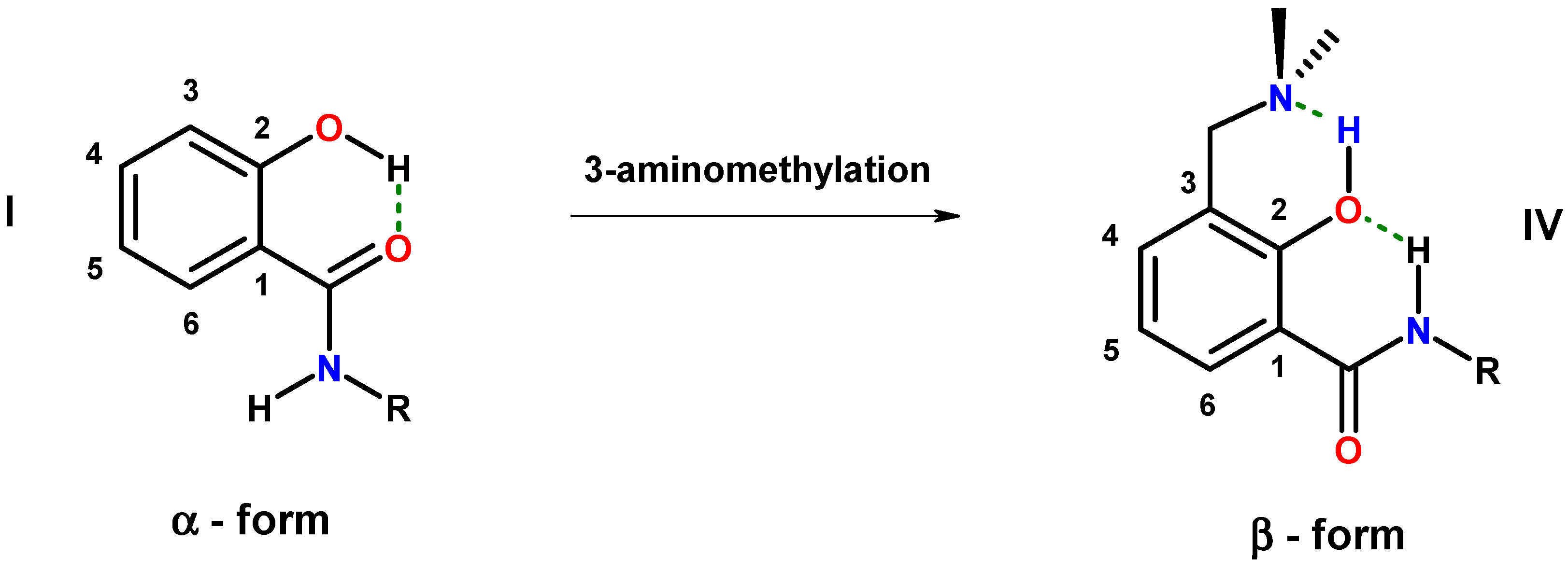 Another possibility to control the conformation is 3-aminoalkylation of salicylamides, which introduces a basic functionality with an available nitrogen lone pair able to compete with the amide oxygen for the acidic hydrogen of the phenolic group. Such a reaction affords a hybrid composed of salicylamide and a Mannich base. The presence of a basic nitrogen of the 3-aminomethyl residue is in ideal premise for the formation of an intramolecular hydrogen bond to the phenolic hydrogen, which should trigger the conformational change from the α- to the β-form (Figure 3, IV).