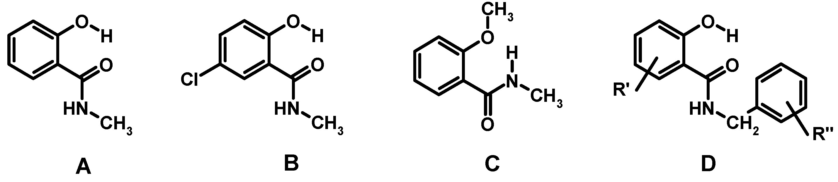 - Zhang, Q.-X.; Zhang, B.-S. N-Benzyl-2-hydroxybenzamide. Acta Crystallogr. Sect. E 2008, 64, o884. [Google Scholar] [CrossRef]