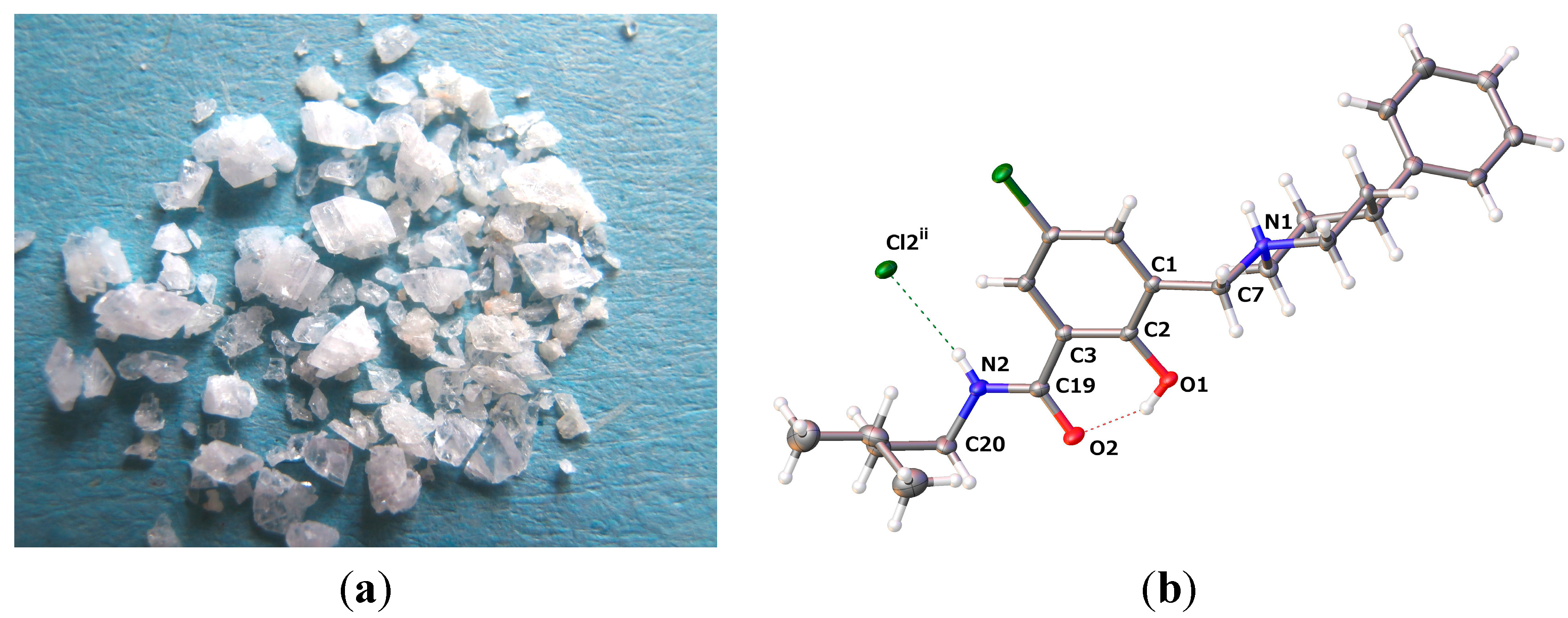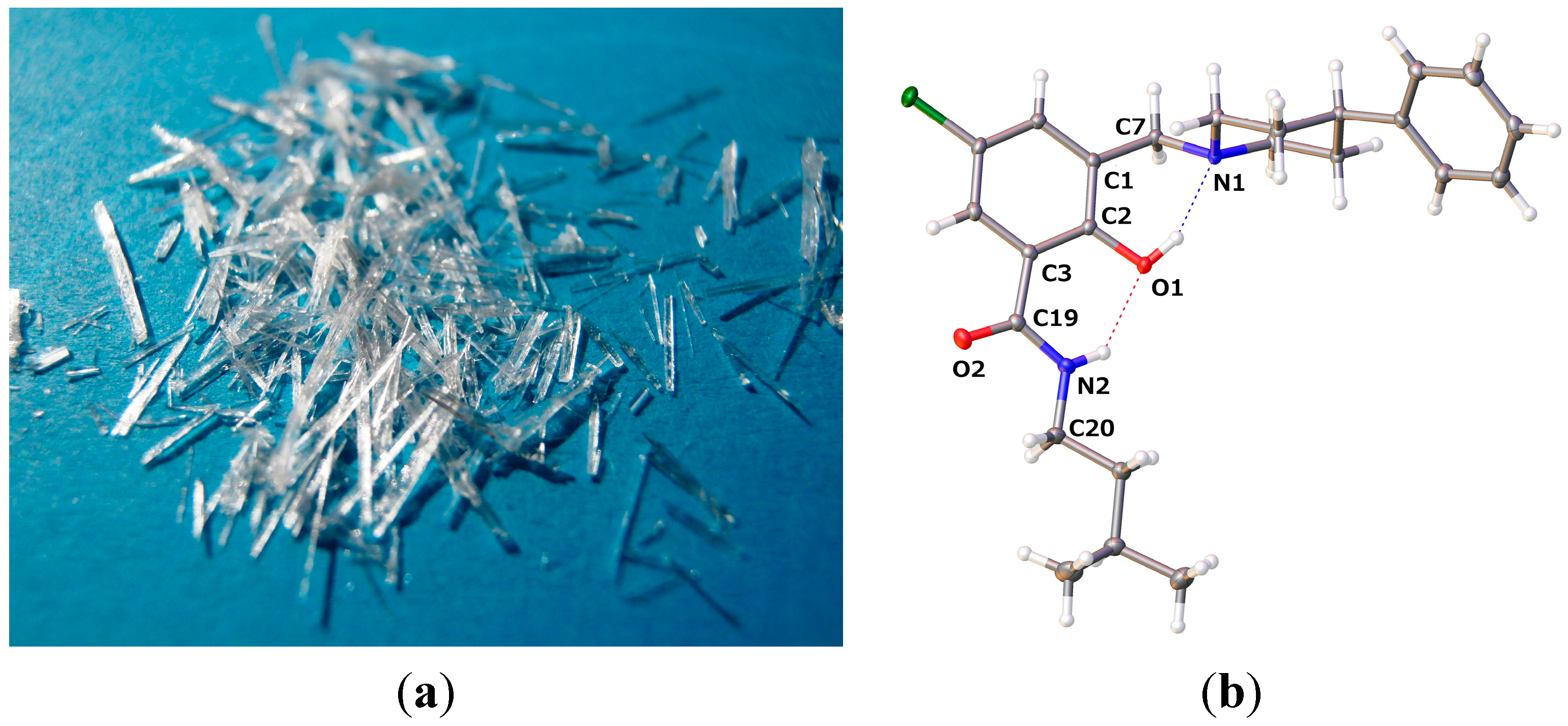 - Imramovsky, A.; Pauk, K.; Padelkova, Z.; Hanusek, J. Crystal Structure of the 5-Chloro Salicylamides: Three Different Types of the H-bonding Influenced Linear Chain Formation in the Solid State. Crystalls 2012, 2, 349–361. [Google Scholar] [CrossRef]