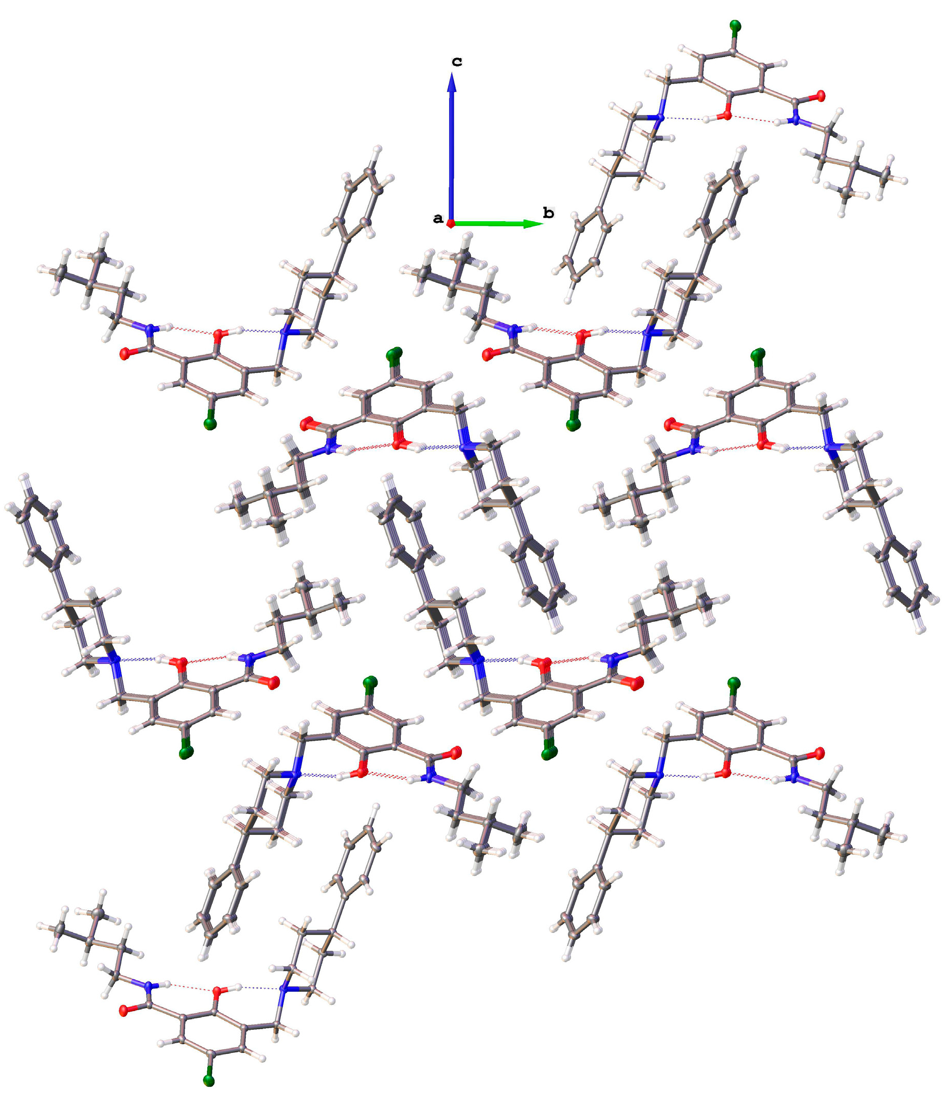 Crystal structures of parent primary salicylamide (2-hydroxybenzamide) have been reported by Sasada et al. [84] and Pertlik [85]. Solid state structures for secondary and tertiary salicylamides are documented in several publications [80,86,87,88,89,90,91]. To the best of our knowledge, there are no crystal structures for hybrids of salicylamide and the Mannich base reported (a substructure search in the database of Cambridge Crystallographic Data Centre (CCDC) did not reveal comparable structures).