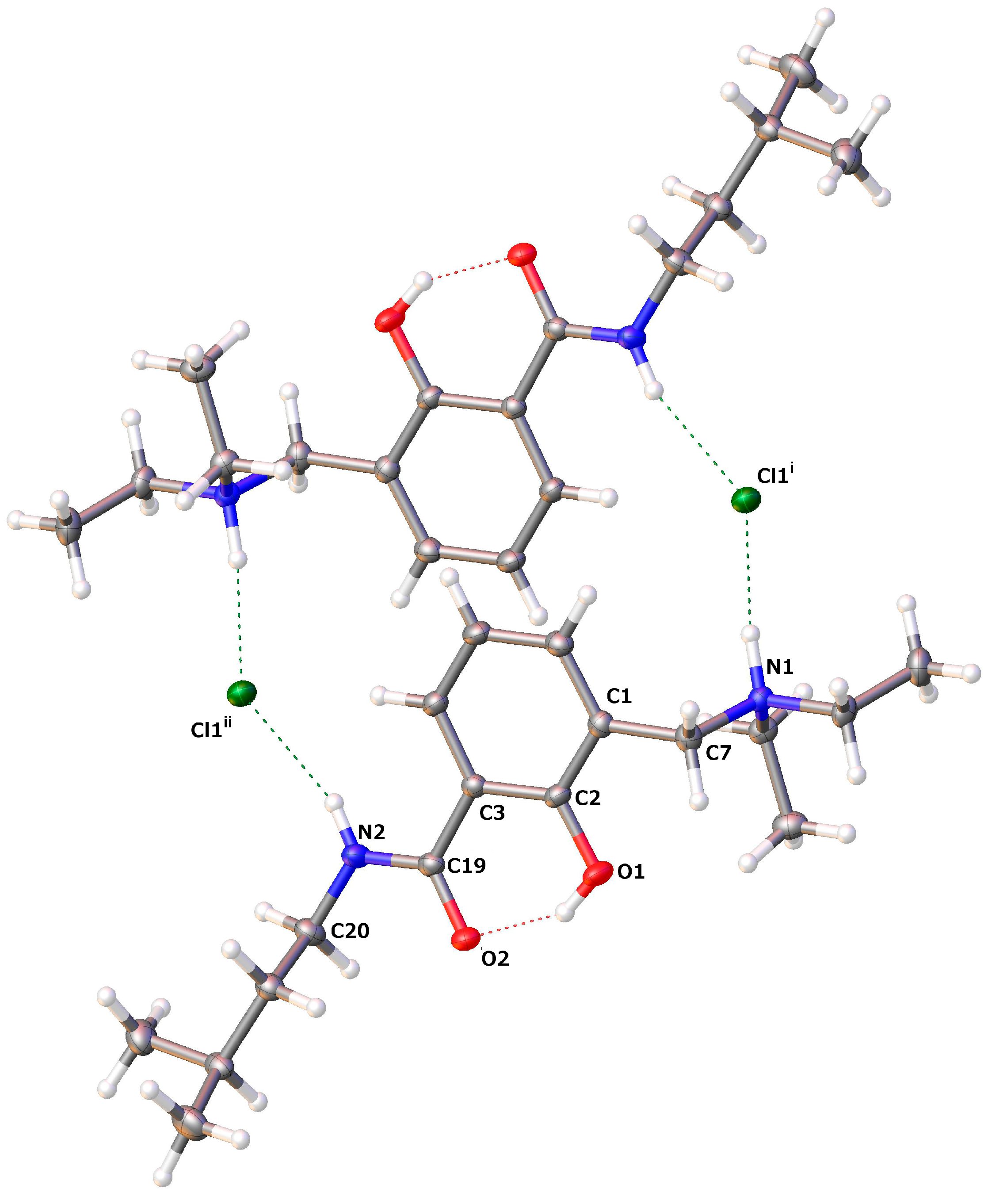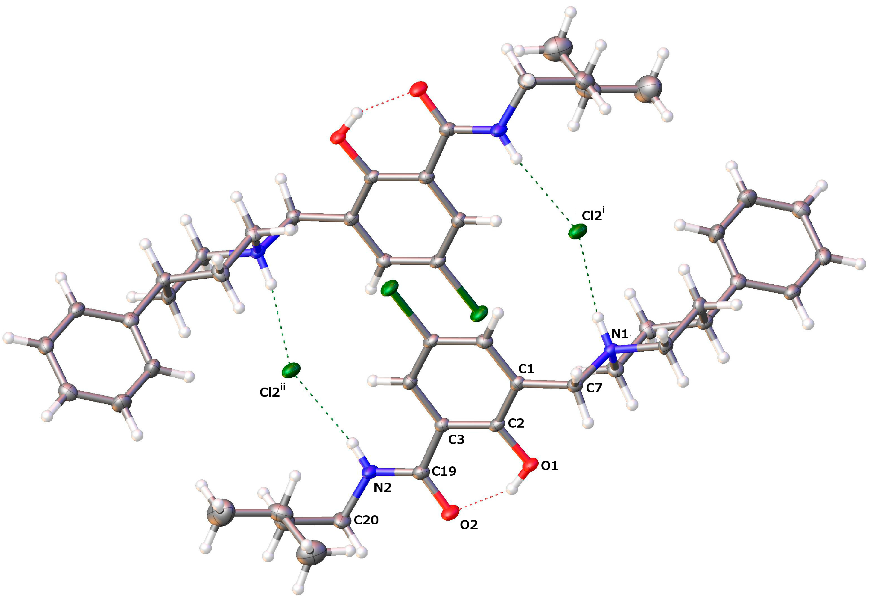 Competition for the basic nitrogen with a strong acid, such as hydrogen chloride, should also destroy the hydrogen bonding of the less acidic phenol and consequently switch back the β-conformation of the hybrids into the α-form of the parent amides. For this purpose, we prepared hydrogen chloride salts of salicylamide-Mannich base hybrids 3, 6 and 9, respectively (Figure 6). Unfortunately, NMR inspection in chloroform-d1 was not feasible, due to the insolubility of the hydrochlorides. We were able to grow X-ray diffraction quality crystals of hydrochlorides of 9 (×HCl: 13) and 3 (×HCl: 14). The hydrochloride of 5-chloro substituted derivative 6 (×HCl: 15) was isolated as a powder of tiny crystals. As expected, at least in the solid state, the conformation switched back from the β- to the α-form for both hydrochlorides 13 and 14 (Figure 6: 13; for 14, see Section 2.2.3).