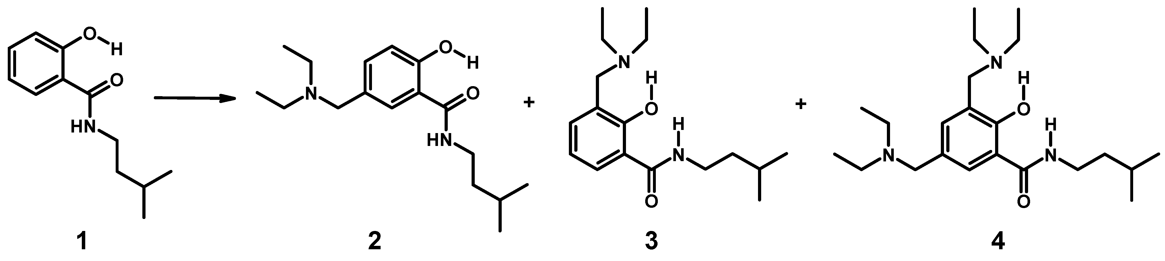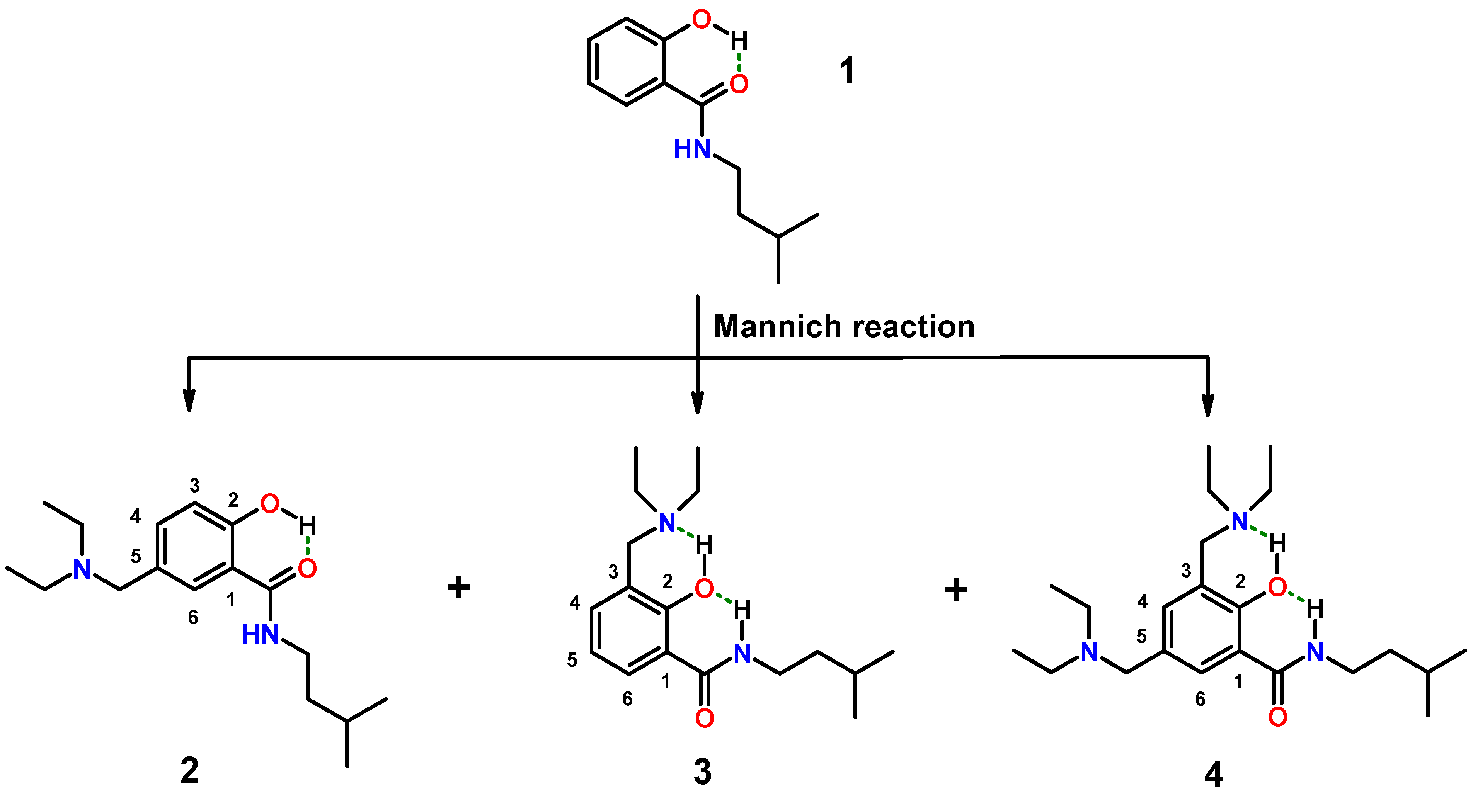 Formation of mixtures of C-Mannich bases is programmed due to unsubstituted 3- and 5-positions in 1. Both positions are amenable to electrophilic attack by iminium ions. We attempted to isolate all possible isomers by offering one equivalent of amine for the reaction. Only isomers 3 and 4 contain N-diethylaminomethyl residues in position 3 of the salicylamide scaffold, which would be mandatory for intramolecular hydrogen bonding of the acidic phenol-hydrogen to the basic nitrogen of the Mannich base. The nitrogen of the 5-aminomethyl residue in isomer 2 is expected to form intermolecular hydrogen bridges. The synthesis is depicted in Scheme 1.