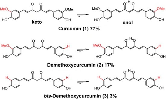 - Payton, F.; Peter Sandusky, P.; Alworth, W.L. NMR Study of the solution structure of curcumin. J. Nat. Prod. 2007, 70, 143–146. [Google Scholar] [CrossRef] [PubMed]