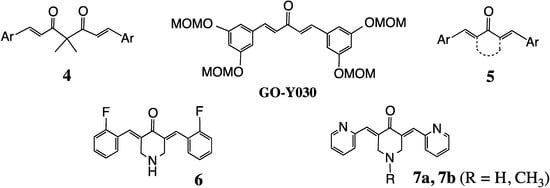 Curcumin mimics. FLLL series (4), GO-series (GO-Y030), MACs as acycle or ring (5), EF24 (6), EF31 (R = H, 7a), UBS109 (R = Me, 7b).